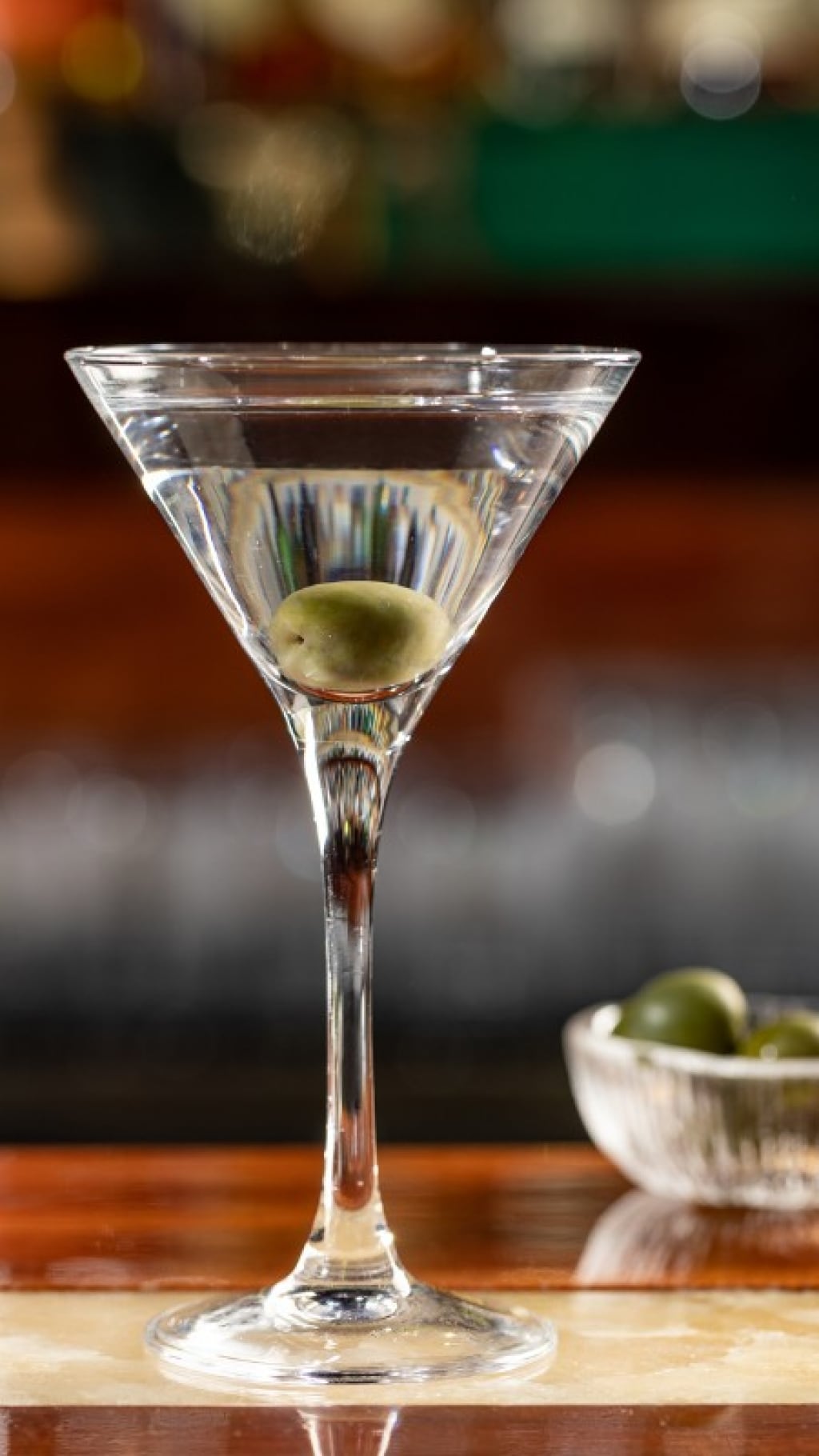 Versate in una coppetta ghiacciata con l'aiuto di uno strainer e guarnite aggiungendo un'oliva.