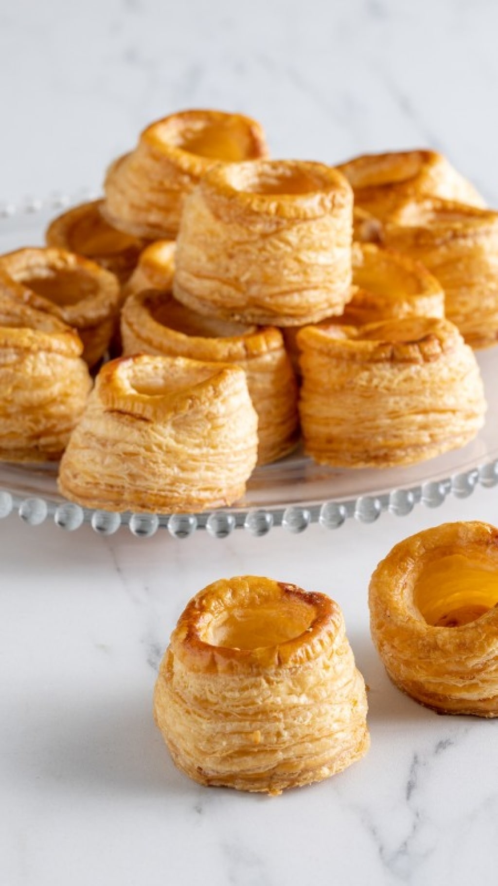 I leggerissimi vol au vent (volo al vento) sono dei cestini fatti da più strati sovrapposti di pasta sfoglia, spennellati con uovo e cotti in forno. Si servono come antipasto o finger food, farciti nei modi più vari. La ricetta base che vi proponiamo spiega, passo dopo passo, come realizzare questi fragranti canestrini pronti per mille ripieni diversi, dal salato al dolce.