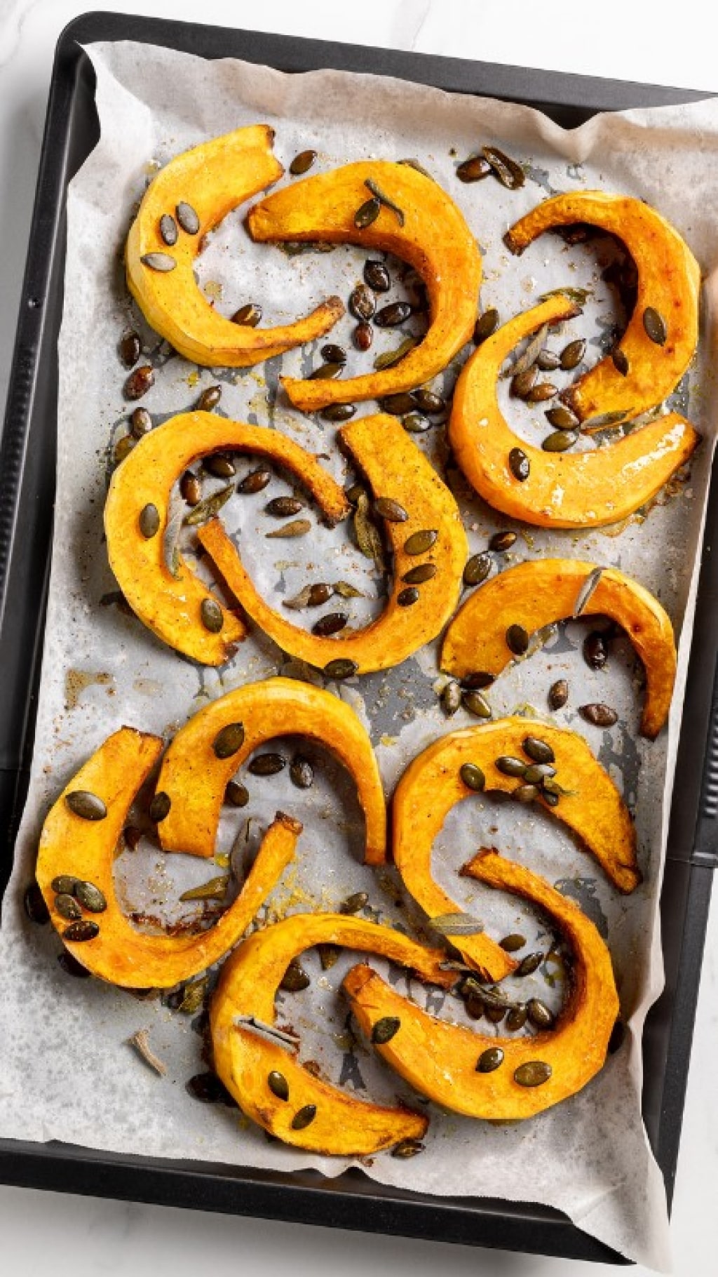 Condite gli spicchi con l’olio, il sale e il pepe passandoli in una ciotola. Quindi disponeteli in una teglia ricoperta con la carta forno e cospargeteli con qualche foglia di salvia e i semi di zucca.