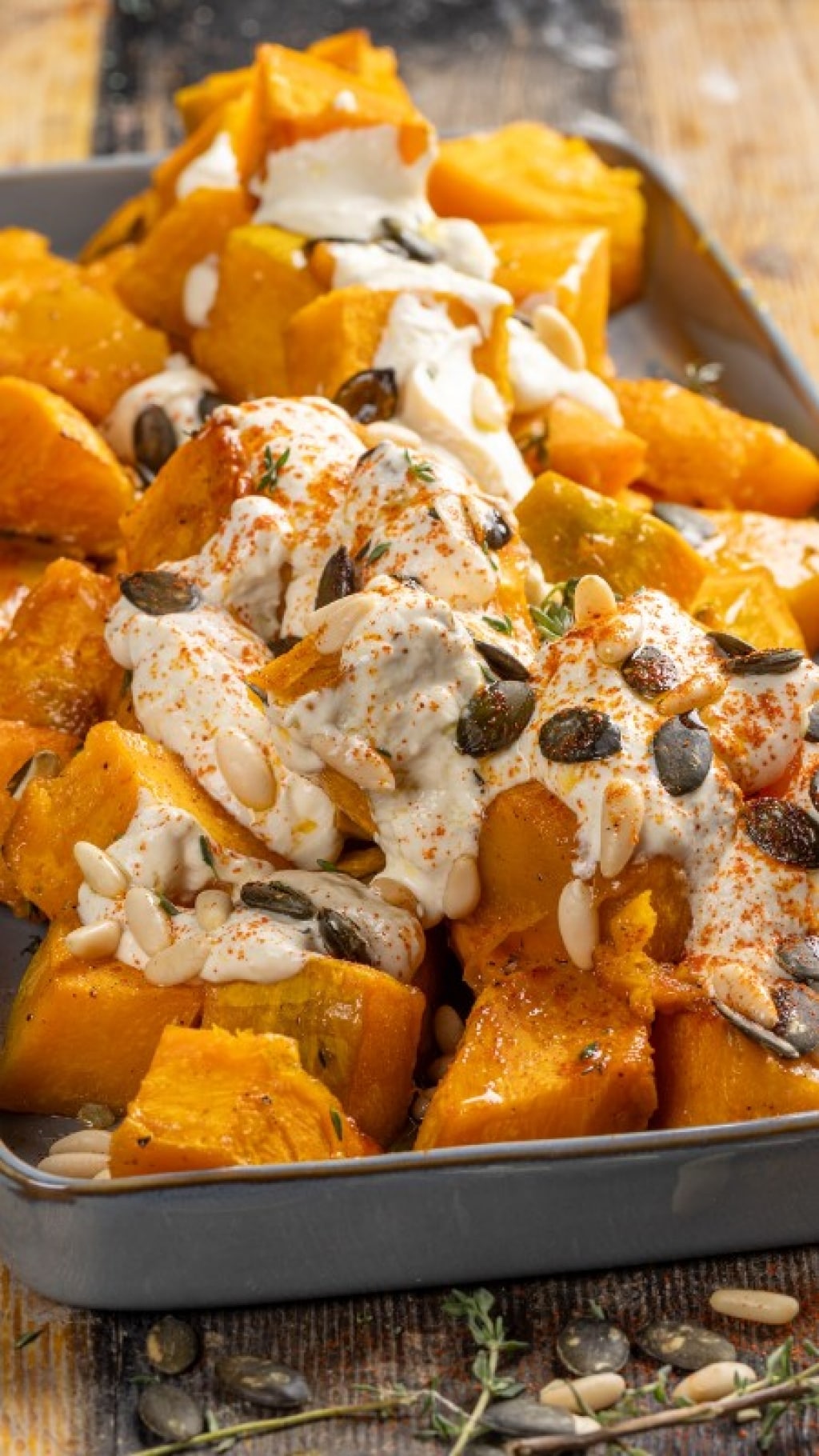 Una ricetta facile, veloce e vegetariana che prevede di arrostire cubotti di zucca e servirli con una salsa di yogurt greco resa stuzzicante dalla presenza della senape. Pinoli e semi di zucca tostati aggiungono un morso croccante alla composizione.