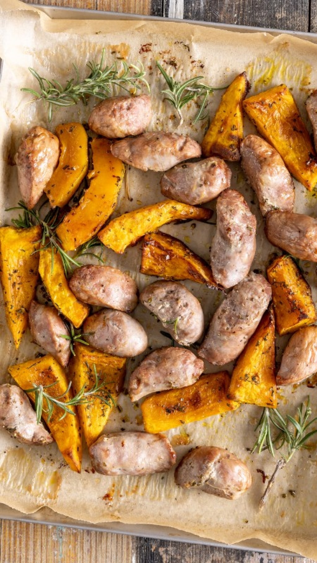 Per dorare la zucca azionate il grill durante gli ultimi 5 minuti di cottura, facendo attenzione che non si scurisca troppo. Sfornate e servite zucca e salsiccia aggiungendo del rosmarino fresco, sale e pepe.