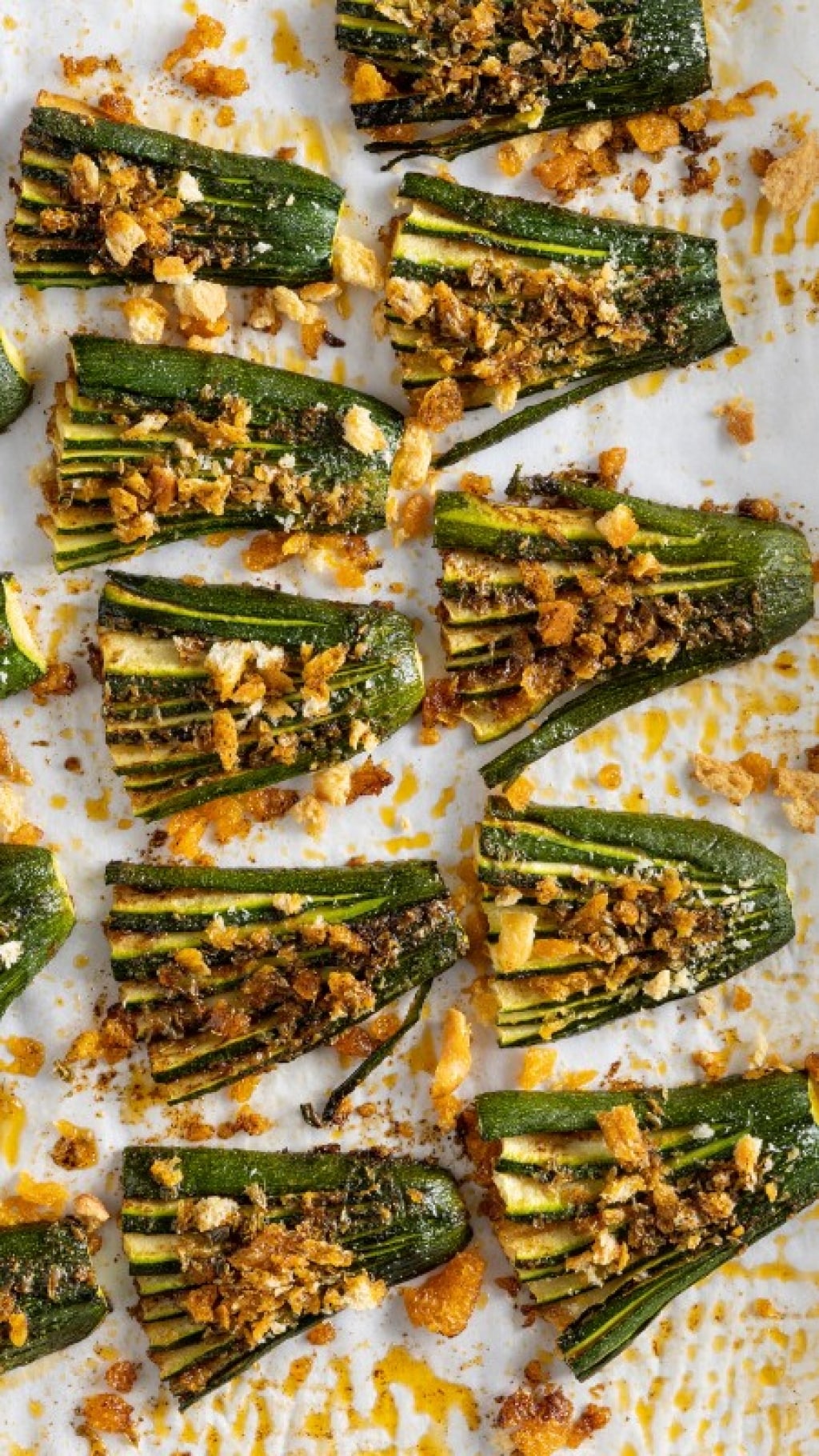 Anche il taglio delle zucchine contribuisce alla buona riuscita della ricetta: allargandole a ventaglio, infatti, è possibile condirle bene in ogni punto, senza esagerare con la quantità di condimento.