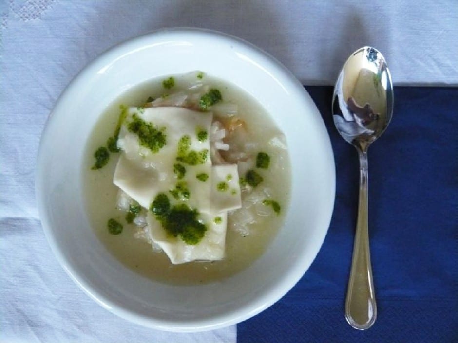 Nelle fondine versa la zuppa avendo cura di tener separate le croste. Poni al centro del piatto le losanghe, poi con un cucchiaio sgocciola il pesto leggero.