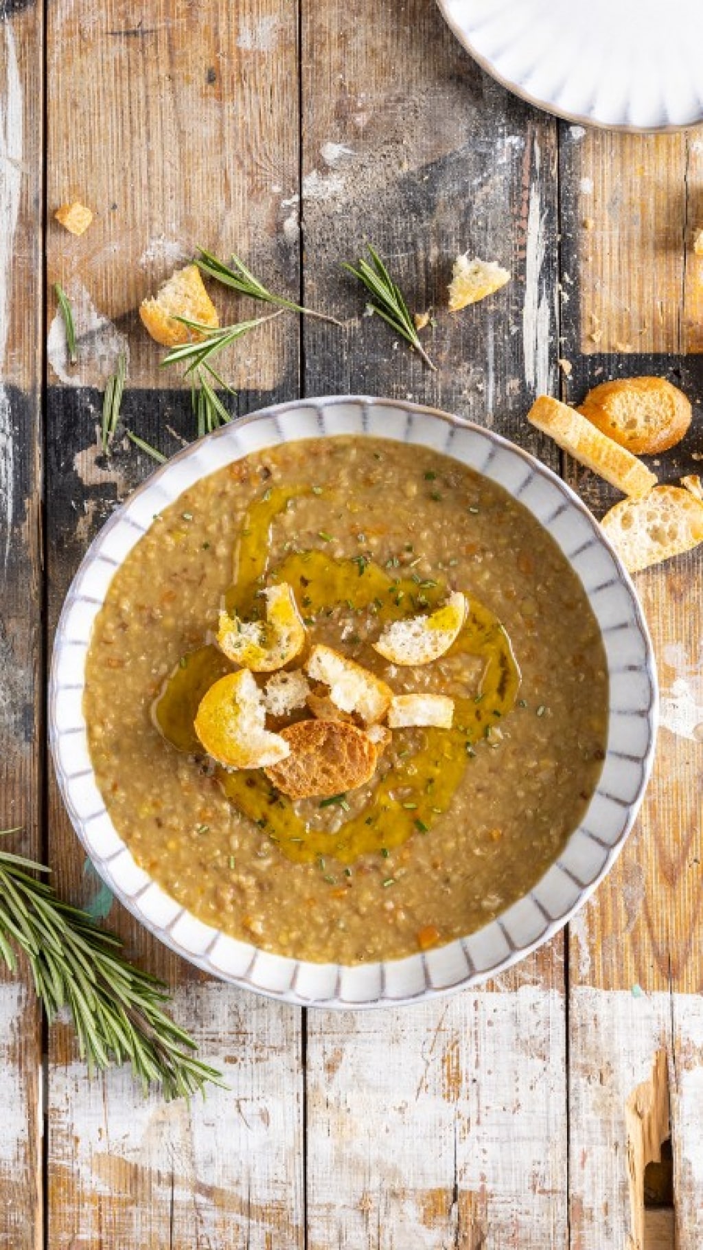 Completate con un giro di olio, degli aghi di rosmarino tritati e dei crostini di pane a piacere. La zuppa di lenticchie è pronta per essere servita.