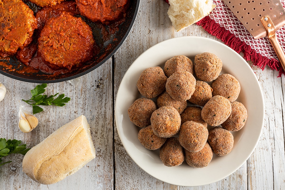 Con il macinato a base vegetale abbiamo preparato le polpette, nel modo classico, macinato, pane, uova, parmigiano, prezzemolo, aglio, sale e pepe. Mentre i burger sono finiti nella più classica delle pizzaiole. Una scelta guidata anche dal sospetto che ci volesse qualche abile accortezza per cuocerli senza condimento e la nostra inesperienza ci ha portati a essere cauti. Ci sono parse due opzioni onnivore popolari anche per sperimentare due cotture differenti: fritto e in umido.
