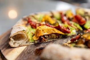 Ed è proprio la pizza di Primavera che Daniele Falcone ha preparato con la sua brigata per Cucchiaio. Una pizza vegana e super gustosa, realizzata con impasto semi integrale biologico e lievito madre, condita con zucchine in crema e fritte, fiori di zucca, polline d’api, pomodori rossi semi-dry, mandorle tostate, e giro di olio extravergine di oliva alla menta. Insomma: bella e buona, tutta condividere.