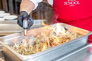 Attenzione: vi raccontiamo il procedimento seguito dallo chef ma si sconsiglia di ripetere l'operazione di affumicatura della carne con paglia e cannello nelle cucine di casa, questa operazione può essere pericolosa