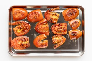 Nel frattempo, lo chef ha saltato i finferli in padella con un filo d'olio e un pizzico di sale. Terminato il riposo di affumicatura del lombatello, ha passato la carne sulla piastra cuocendola uniformemente per circa 4 minuti su tutti i lati. Ha poi piastrato anche i pomodori tagliati a fette per abbrustolirli leggermente.